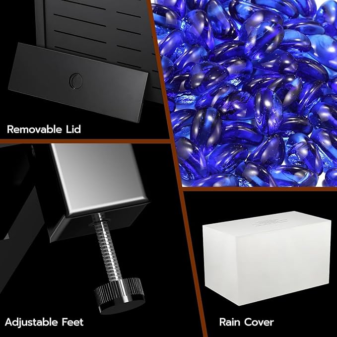 - Package Includes:One 42.91*22.05*24.80in 63.58lb,fire pit table with table lid,metal stand,control knob,guard,fire bowl,burner,electronic igniter,foot pad(*4),glass stones,protective cover,washer(*20) and product manual.