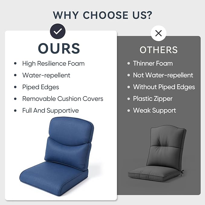 - Perfect Fit & Generous Dimensions: Achieve a custom-fit look with our patio cushion set, including 1 seat cushion (22" W x 24" D x 4" T) and 1 back cushion (22" W x 22" H x 6" T). This deep seat cushion and tall back are designed for superior comfort and support on most outdoor furniture. Pro Tip: For the perfect fit, we recommend measuring your furniture's seating area before ordering to ensure ideal coverage and a seamless look