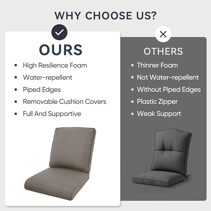 - Perfect Fit & Generous Dimensions: Achieve a custom-fit look with our patio cushion set, including 1 seat cushion (22" W x 24" D x 4" T) and 1 back cushion (22" W x 22" H x 6" T). This deep seat cushion and tall back are designed for superior comfort and support on most outdoor furniture. Pro Tip: For the perfect fit, we recommend measuring your furniture's seating area before ordering to ensure ideal coverage and a seamless look