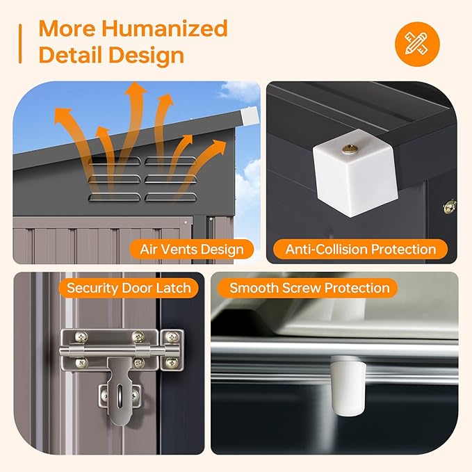 - Robust & Weatherproof Build: This outdoor storage shed is constructed from galvanized steel with waterproof engineering. It delivers enduring resilience against severe weather. Its reinforced metal roof and walls prevent deformation, while the sturdy frame withstands winds up to 30mph (Level 6) and snow loads of 6 inches.