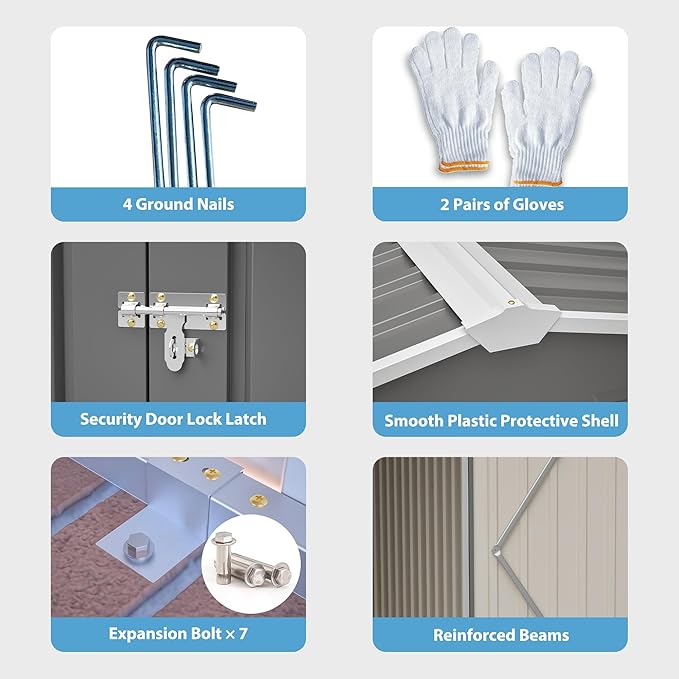- 【Easy Installation】All accessories, including the screwdriver bit, wrenches, gloves, and instruction manual, are neatly packed in three boxes. Every part in the package is pre-numbered for easy identification. The pre-cut and pre-drilled panels make assembly straightforward and hassle-free. With no prior experience required, you can effortlessly set up this utility backyard shed.