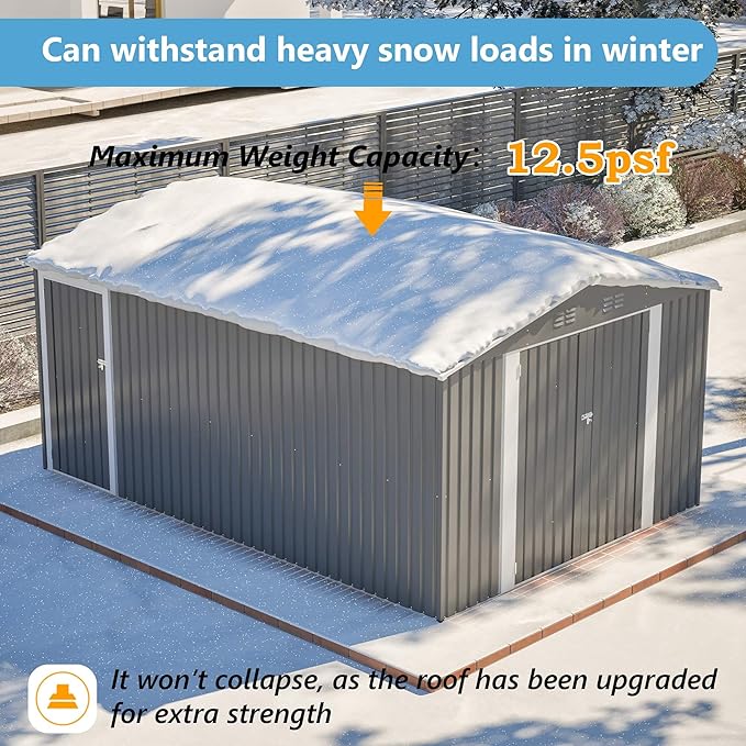 - 【Reinforced Structure】There's nothing more frustrating for gardeners than a collapsed garden tool shed. Luckily, this large sheds & outdoor storage 10x14 features upgraded reinforced windproof ground stakes and steel frame, with a roof that supports up to 10 lbs/sqft. The 0.25mm thick steel plates are coated with high-quality paint, making it rust, UV, and moisture-resistant, ensuring durability and the ability to withstand harsh weather for at least 10 years.