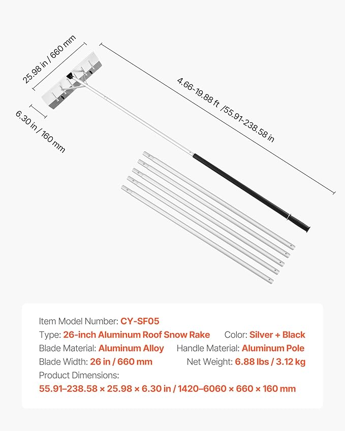 - Easy Installation & Storage: The roof rake can be assembled easily without tools. The detachable handle saves space for compact storage. It is ideal for residential, garage, and car roofs to clear snow and fallen leaves effortlessly