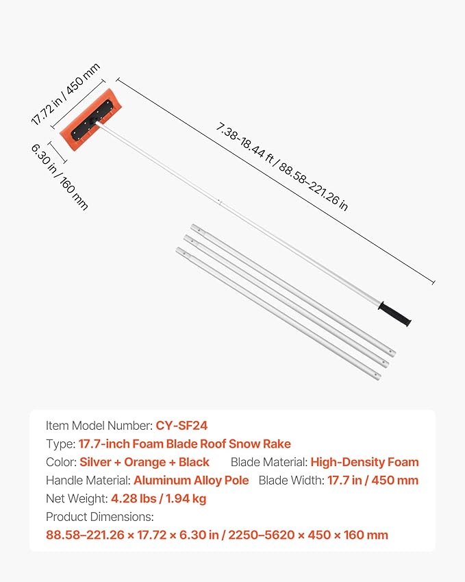 VEVOR Snow Roof Rake, 17.7 in Foam Blade, 7.3-18.4 ft Adjustable Roof Snow Scraper, Extension Tubes & Non-Slip Handle, Lightweight Snows Removal Tool for House Leaves Debris Clearing