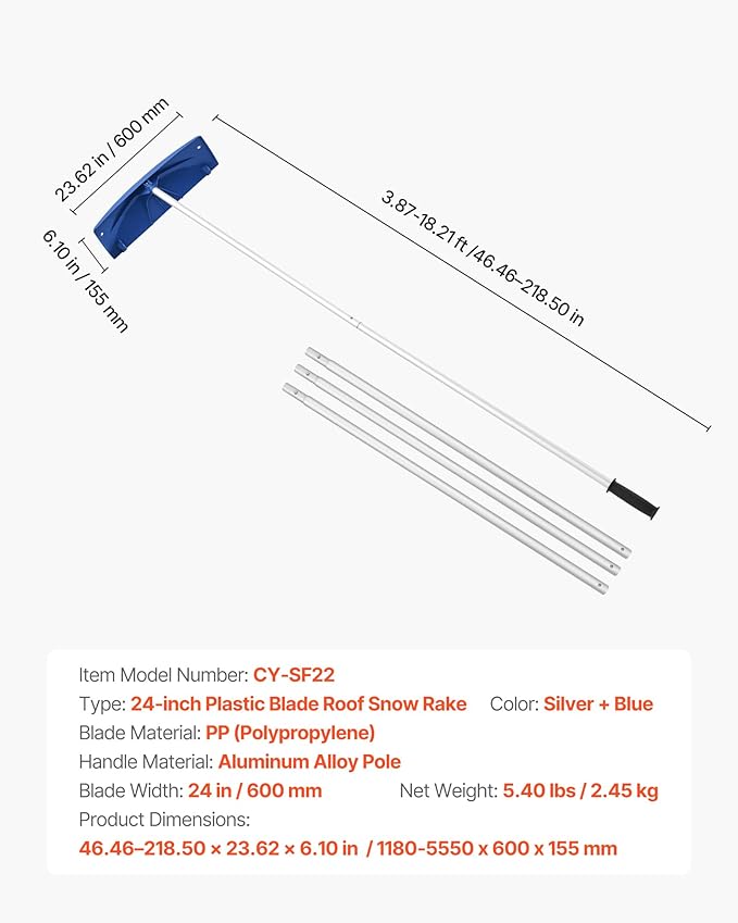 VEVOR Snow Roof Rake, 24 in PP Plastic Blade, 3.8-18.2 ft Adjustable Roof Snow Scraper with Wheels, Anti-Slip Handle Snows Removal Tool, Lightweight House Rooftop Rake for Leaves Debris Removal