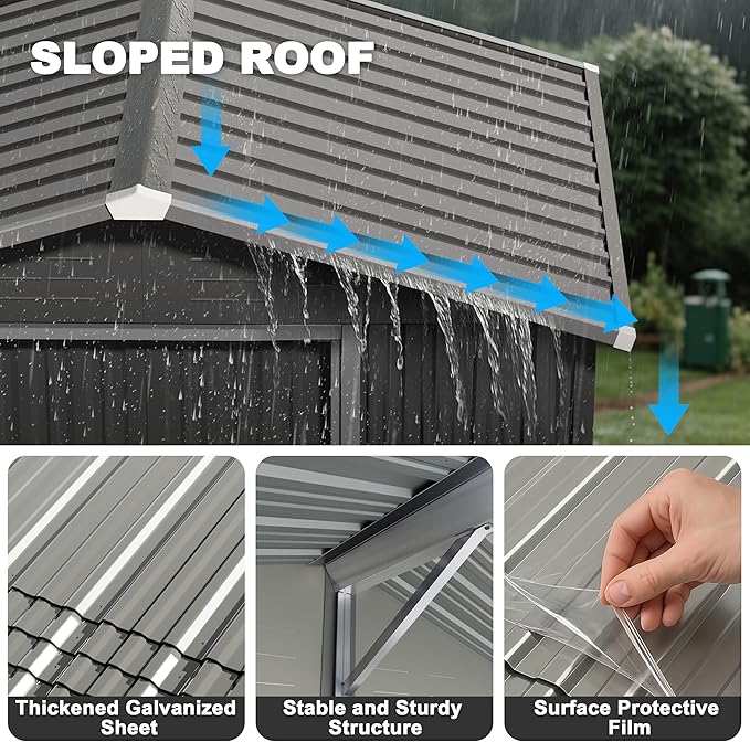 - REINFORCED STRUCTURE WITH SLOPED ROOF:The steel frame resists warping, while the 16° roof prevents water buildup. A 28.3" wide door fits most tools and mowers—great for any garden storage shed setup