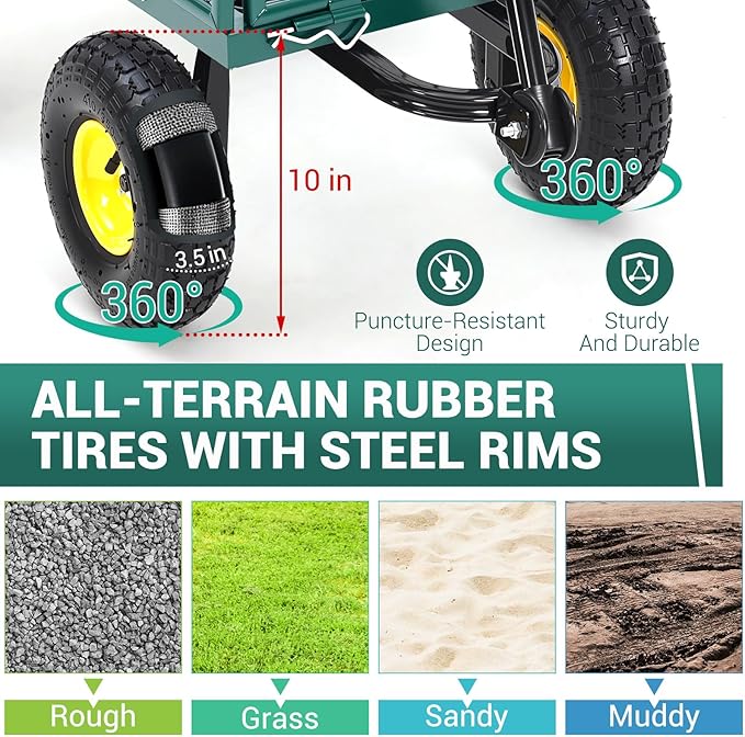 - UPGRADED TIRE TECHNOLOGY: This gardening wheelbarrow is equipped with 10-inch pneumatic rubber tires that provide excellent shock absorption and a quiet ride. These wear-resistant tires can easily cope with different surfaces, such as gravel paths or green grass, to ensure that you enjoy a hassle-free operation experience during transportation.