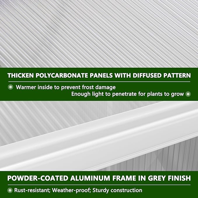 - Heavy Duty Greenhouse for Outdoor: The frame of our greenhouse is made of premium, corrosion and weather resistant powder coated 0.7MM thickened aluminum which is rust resistant and stable in all climates. 4MM double wall polycarbonate panels provide extra warmth for the plants and prevent frost, making the plants absorb more sunlight and thrive