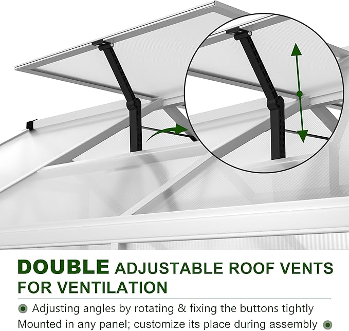 - Adjustable Roof: Our outdoor greenhouse has four-level adjustable roof vent for ventilation which is a pole less mode with pulleys to meet your need by adjust it to a suitable angle. You can just rotate and fix the bottom tightly to regulate the airflow and create an ideal growth environment for your plants. You can mount it in any panel and customize its place during assembly