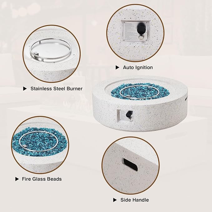 - 【Premium MgO Material with Terrazzo-Like Finish】Experience the luxury of Magnesium Oxide (MgO), a premium terrazzo-like material that is sturdy, lightweight, and waterproof. Perfect for outdoor use, this fire pit propane for outside patio provides long-lasting durability and a sophisticated aesthetic, making it a standout propane fire pit table for patios, gardens, and backyards