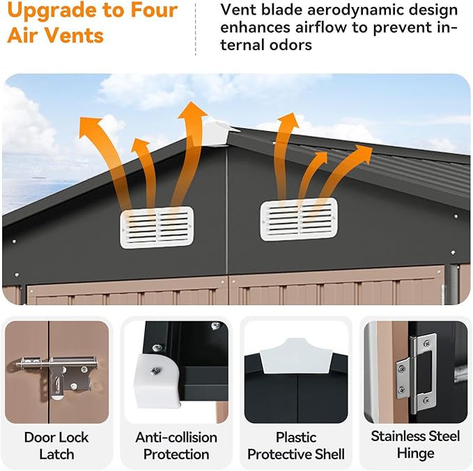 - 【Enhanced Versatility & Spacious Design】Our 10x10ft metal shed delivers a remarkable internal storage, making it ideal for a wide range of uses—from garden shed to generator storage or secure bike shed. The dual front doors allow easy access for larger equipment like bicycles and lawn mowers. A sloped roof enhances runoff and adds weather resilience, while a built-in ventilation vent minimizes moisture, keeping your tools dry and well-protected throughout the year.