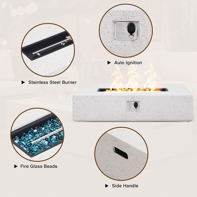 - 【Premium MgO Material with Terrazzo-Like Finish】Experience the luxury of Magnesium Oxide (MgO), a premium terrazzo-like material that is sturdy, lightweight, and waterproof. Perfect for outdoor use, this fire pit propane for outside patio provides long-lasting durability and a sophisticated aesthetic, making it a standout propane fire pit table for patios, gardens, and backyards