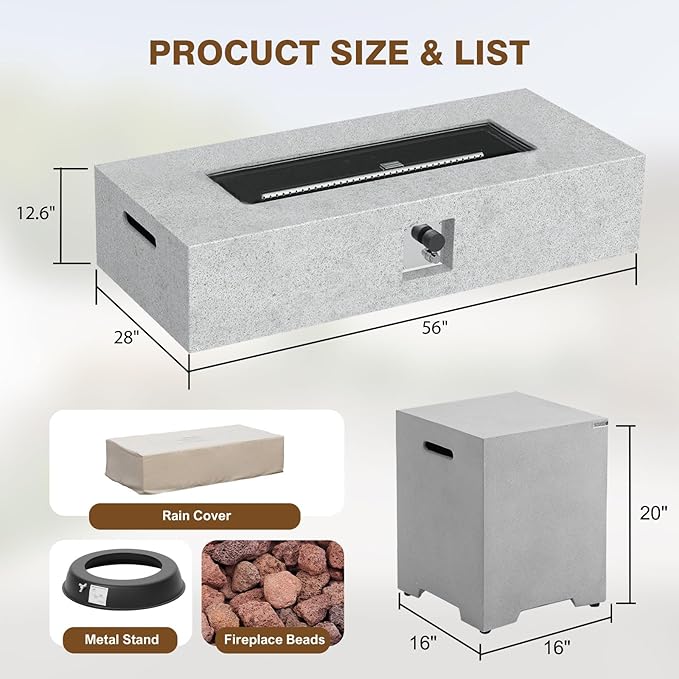 - 【Easy Assembly & Perfect Outdoor Fit】Designed for straightforward assembly with all hardware and instructions included. Once assembled, this outdoor fire tables set fits seamlessly on patios, decks, or gardens. Dimensions: fire table 56" W x 28" D x 12.6" H, and tank table 16" W x 16" D x 20" H. A premium, functional fire pit gas solution for your backyard
