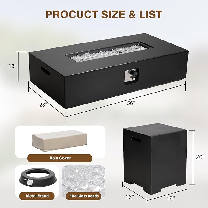- 【Easy Assembly & Perfect Outdoor Fit】Designed for straightforward assembly with all hardware and instructions included. Once assembled, this outdoor fire tables set fits seamlessly on patios, decks, or gardens. Dimensions: fire table 56" W x 28" D x 13" H, and tank table 16" W x 16" D x 20" H. A premium, functional fire pit gas solution for your backyard