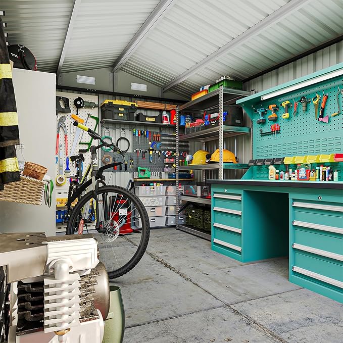 - 【Enhanced Versatility & Spacious Design】Our 8x12ft metal shed delivers a remarkable internal storage, making it ideal for a wide range of uses—from garden shed to generator storage or secure bike shed. The dual front doors allow easy access for larger equipment like bicycles and lawn mowers. A sloped roof enhances runoff and adds weather resilience, while a built-in ventilation vent minimizes moisture, keeping your tools dry and well-protected throughout the year.