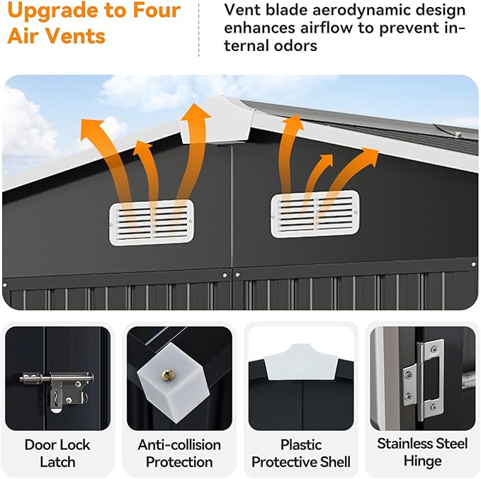 - 【Enhanced Versatility & Spacious Design】Our 8x10ft metal shed delivers a remarkable internal storage, making it ideal for a wide range of uses—from garden shed to generator storage or secure bike shed. The dual front doors allow easy access for larger equipment like bicycles and lawn mowers. A sloped roof enhances runoff and adds weather resilience, while a built-in ventilation vent minimizes moisture, keeping your tools dry and well-protected throughout the year.
