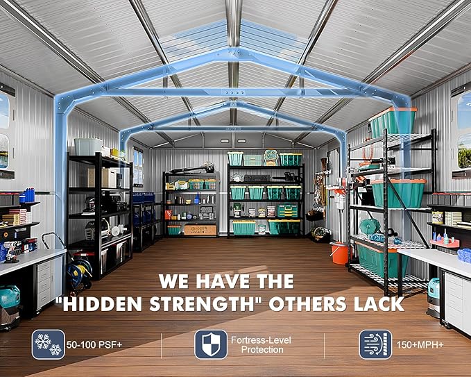 - 🛡️ ALL-WEATHER ARMOR WITH REINFORCED TRUSS SYSTEM: Engineered to endure. Constructed from heavy-duty(23 gauge) , multi-layered galvanized steel and featuring a unique double-reinforced internal truss and beam system(18 Gauge) (see images), this metal building stands defiant against harsh wind, heavy snow, and rain. It’s not just a shed; it's a permanent, weatherproof fortress for your valuables.