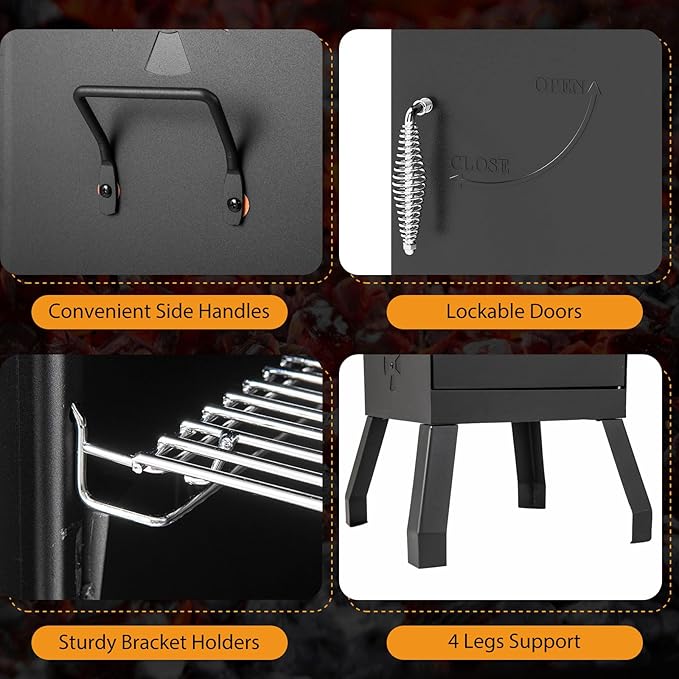- Convenient Access & Safety: With 2 separate access doors, this BBQ smoker lets you check on your food or manage the water and charcoal without losing heat. Both doors are lockable, safeguarding against any accidental openings.