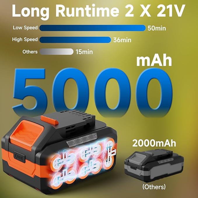 - Upgrade to 2 × 5.0Ah Batteries: Our leaf blower cordless features 2 high-capacity 5000mAh lithium batteries and a fast charger, offering a working time of up to 50 minutes (25 minutes for each battery) on low speed and 36 minutes (18 minutes for each battery) on high speed. The included fast charger fully charges the battery in under 2 hours