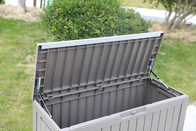 - Hydraulic safety mechanism: The UV protection feature helps maintain the box appearance & structural integrity over time for long lasting use better than wood or metal. Portable & Lightweight: Lift or move the Patio Container using the Built-in handles on both sides to any required place quickly.
