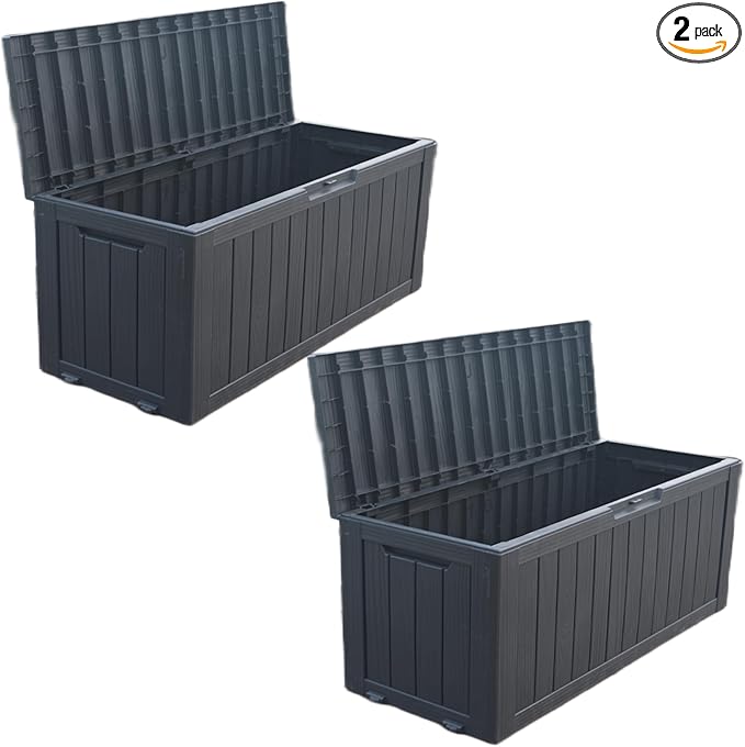 - Elegant Woodlook Texture: Built to last long, Ideal for any garden, backyard, pool area, yard with charming wood like durable design. MULTI PURPOSE USE as a Storage Container, Deck box, stylish seat, patio table , stool or bench. Suitable for mixing and matching or blend into any pool side furniture . Double-Wall frame makes it use as extra table, stool or bench. Comes with extra features of Rust & Fade resistance. Please don't move / transport deck box with stuff inside and do not put in standing water.