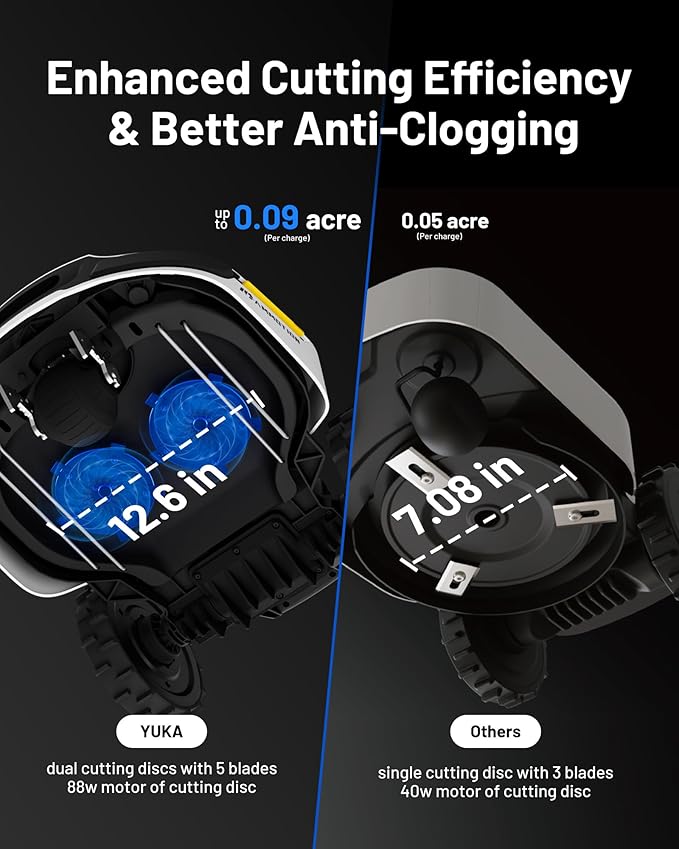 - Enhanced Cutting Technology: Equipped with dual cutting discs featuring five razor blades offers a cutting width of 320mm, YUKA’s 88W motor delivers powerful cutting performance. The anti-clogging floating cutting disc ensures a carpet-like lawn finish, while the dynamic height adjustment (30-100mm (1.2-4 inches)) maintain a consistent cutting height across various terrains. Mow up to 0.09 acre(350 ㎡) per charge.