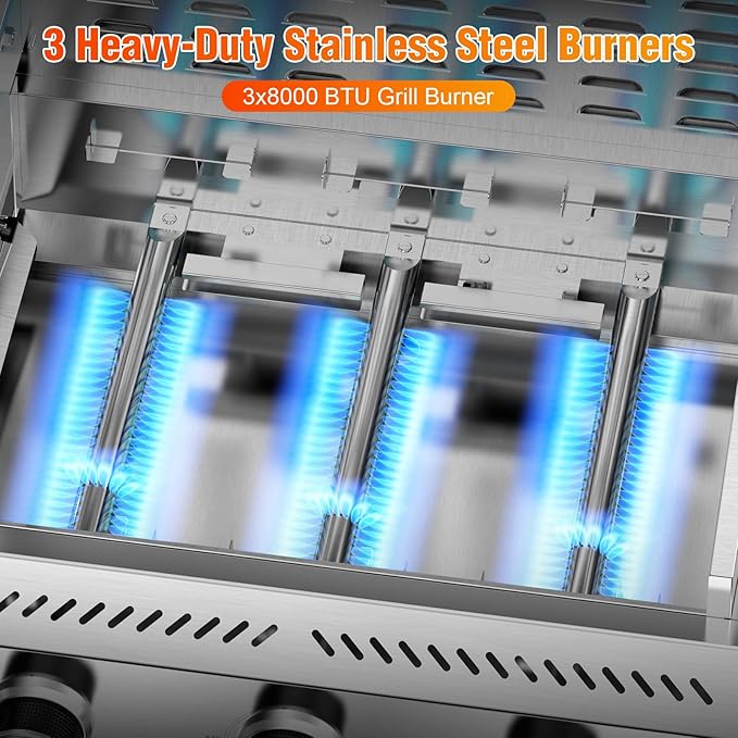 - Precise Temperature Control & Even Heating:This 3 burner grill delivers exceptional heat distribution with three 80,00 BTU stainless steel burners (total 24,000 BTU). Each burner features an independent control knob for precise adjustments, ensuring uniform cooking across the entire gas grill surface. Perfect for searing, roasting, or slow-cooking with consistent results.