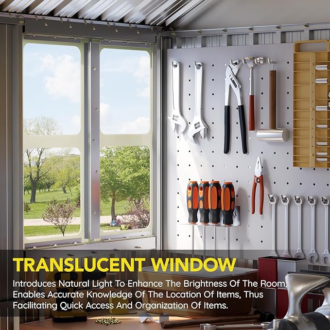 - Compact 8x6 FT Design – Ideal for small outdoor spaces such as patios, balconies, and narrow side yards. Great for organizing tools and supplies.