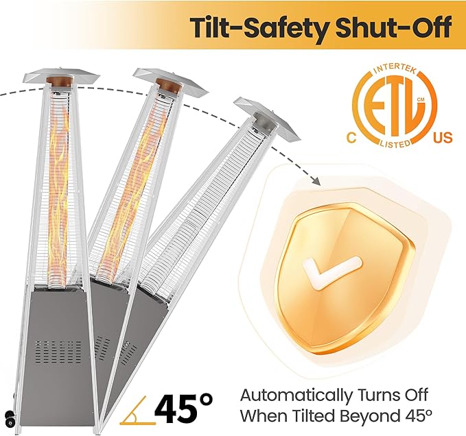 - Safety & Warranty: CSA-certified with tip-over auto shut-off (>45Β°) and flame failure device. Factory-tested for reliable outdoor heating. Includes waterproof cover, gloves, and user manual. The waterproof cover protects the heater from dust, rain, and other outdoor elements when not in use, helping to extend each heater's lifespan. During the warranty period, glass tube replacement is supported if quality issues occur, ensuring safe and reliable use as your outdoor heater solution