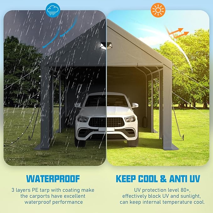- Large Capacity Carport - The size of this car port is 16'L x 10'W x 9.45'H, which provides ample room for you to park car or other vehicles, even you can use it as a temporary warehouse