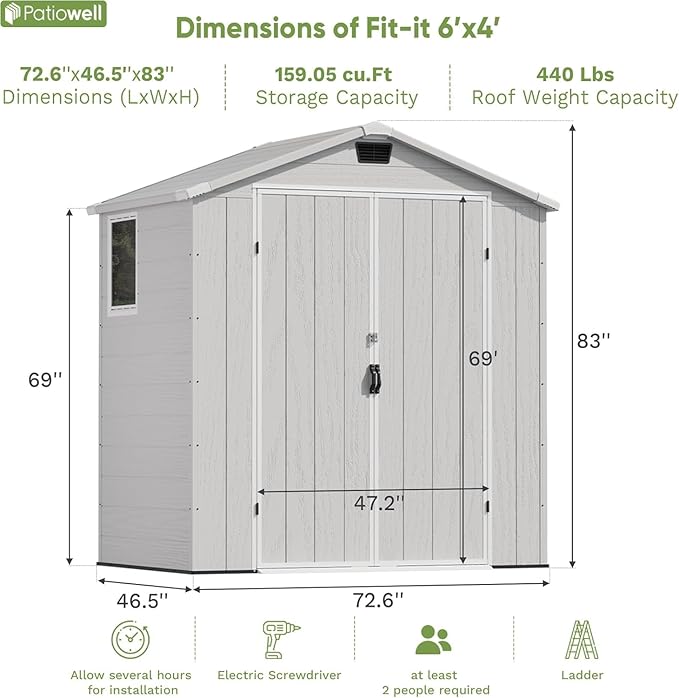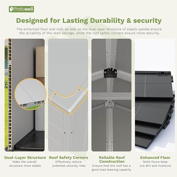 - All-Weather Durability & UV Protection - Built with UV-resistant, high-density plastic panels and a reinforced resin floor, the shed effectively withstands harsh sunlight, heavy rain, and strong winds. Its anti-corrosion and waterproof materials resist warping, cracking, and fading for long-lasting use.