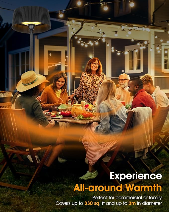 - ADVANCED CARBON INFRARED HEATING TECHNOLOGY - Cobuy patio electric heaters require only a 1500W power setting for instant, consistent and quiet warmth. Covers up to 322 square feet and up to 2-3m in diameter. Our electric deck heaters are more environmentally friendly than traditional heaters like propane heaters, produce no greenhouse gases, and can save you 30-40% on electricity