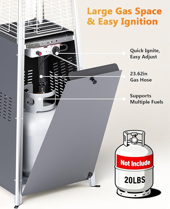 - 【Powerful & Long-Lasting Heat】Our propane heater delivers up to 48,000 BTU of heat, warming a 10-foot radius to keep everyone comfortable even on cold evenings. Designed for convenience, this patio heater works with a standard 20 lb propane tank (not included) and runs 8–10 hours on a full tank. The magnetic side door allows for quick and easy tank replacement, making it one of the most user-friendly patio heaters for outdoor use.