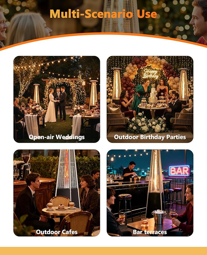 - 【Create a Cozy Atmosphere】More than just a heater, this pyramid-style outdoor heater for patio provides a warm and inviting atmosphere. The dancing flame inside the glass tube delivers elegance and comfort, making it ideal for family gatherings, backyard parties, restaurants, or cafes. These patio heaters for outdoor use guarantee a memorable experience on cool nights.