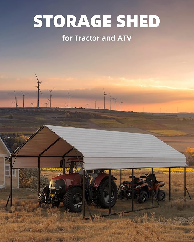 - 【Superior Steel Carport】:Features 19-gauge high-tensile steel pole frame & 27-gauge steel roof panels; all components have triple rust-resistant coating for excellent all-weather durability & stability.