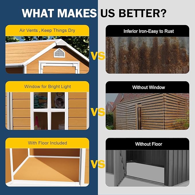 - 【DURABLE CONSTRUCTION WITH FLOOR&WINDOWS】 Made from extra thick double walled polypropylene resin construction & steel is durable enough to resist adverse weather. And the impact resistant floor is insulated from rain and insects, making the outdoor shed with floor corrosion resistant, moisture proof, and more resistant to wind and impact, ensuring that your stored items remain intact in the severe weather