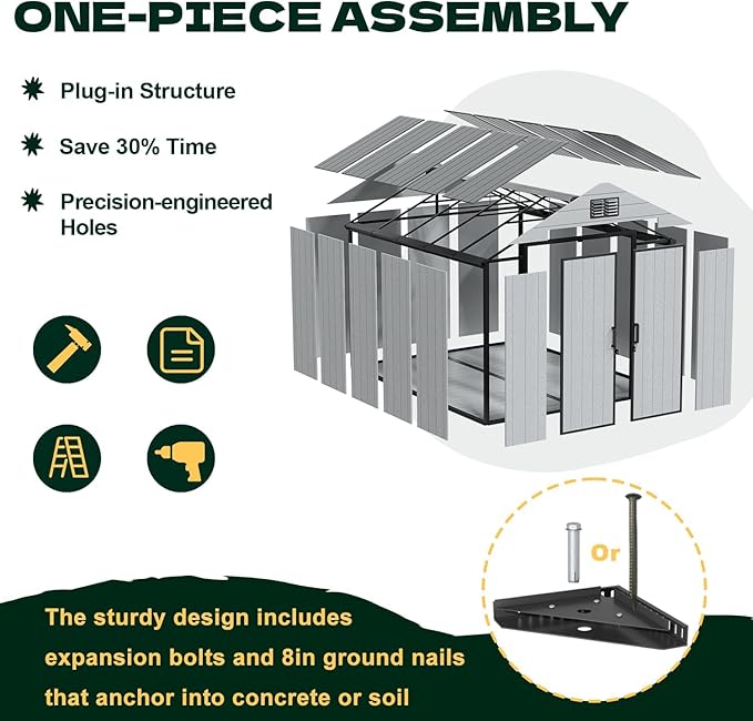 - Easy and Time-Saving Installation: The one-piece panel plug-in structure reduces installation time by 30% compared to traditional sheds. If you encounter any installation problems, please feel free to contact us, we will provide 24-hour answer service. Please rest assured that since the manual contains the installation process of all sizes currently on sale, you only need to read part of it