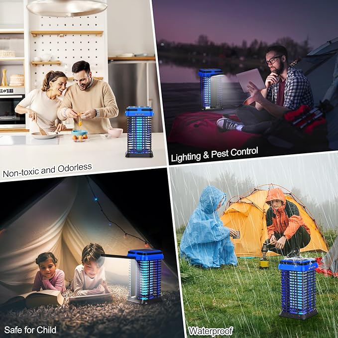 - [Safe for Kids and Pets] Ensure safety with a professional-certified electric mosquito zapper. Its low noise won't disturb even light sleepers. The fly swatter is enclosed in a protective ABS plastic cage with minimal gaps (only 0.3 inches), preventing children and pets from contacting the high-voltage grid while allowing bugs to enter and be eliminated. It's non-toxic and odorless, providing a safe environment. With an IPX8 waterproof rating, it's resilient even in rainy conditions.
