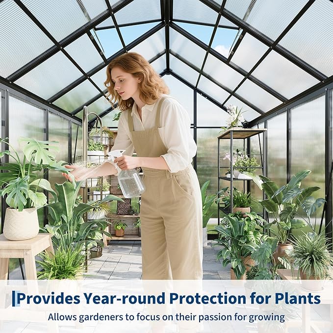 - Resilient Construction to Withstand Tough Weather:Built to endure challenging conditions, this greenhouse features 720g/m² polycarbonate panels paired with a solid aluminum steel frame. This combination ensures stability and protection even during heavy rain and strong winds, keeping your plants safe and thriving for the long term