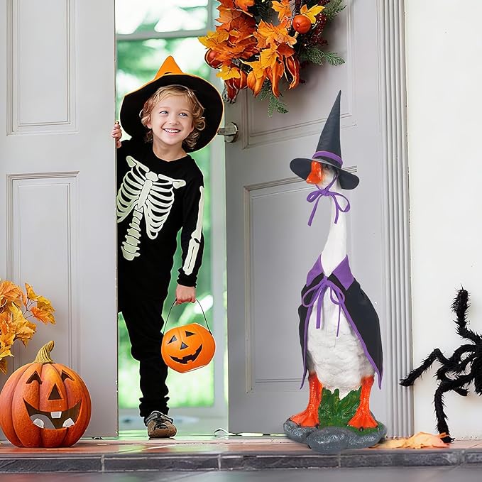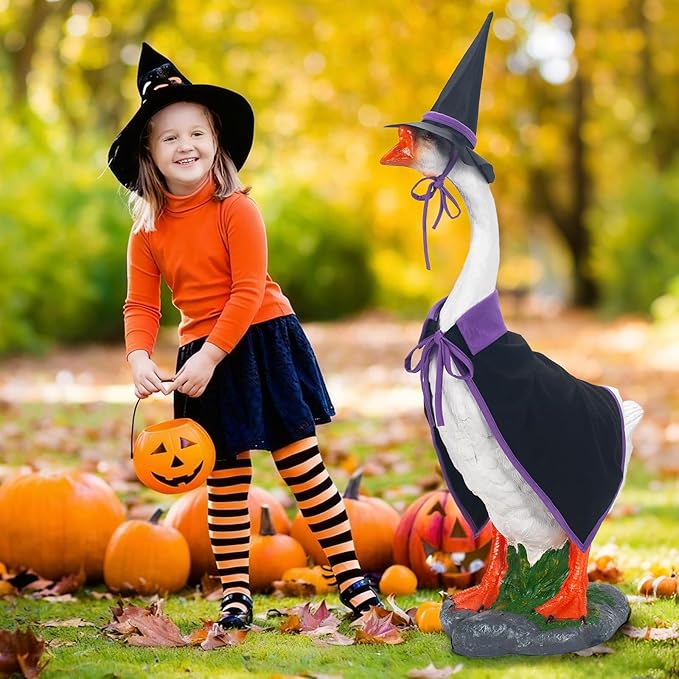 - Fit for Standard Lawn Goose: This goose sculpture outfits Designed to fit standard 58cm/23 inch and 43cm/17 inch lawn goose statues which is a delightful addition to any indoor or outdoor space, the goose witch costume stays securely in place without slipping—keeping your Halloween goose decor looking flawless all season.