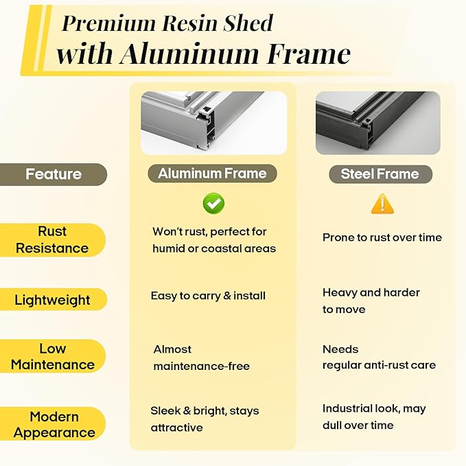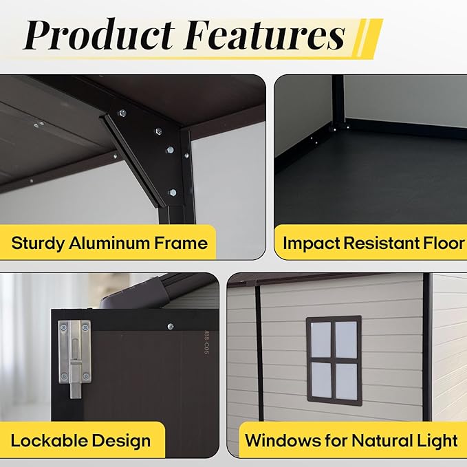 - Durable Construction: Crafted with high-quality resin walls and a rust-resistant aluminum frame, this resin shed withstands rain, snow, and UV exposure, providing long-lasting durability and minimal maintenance.