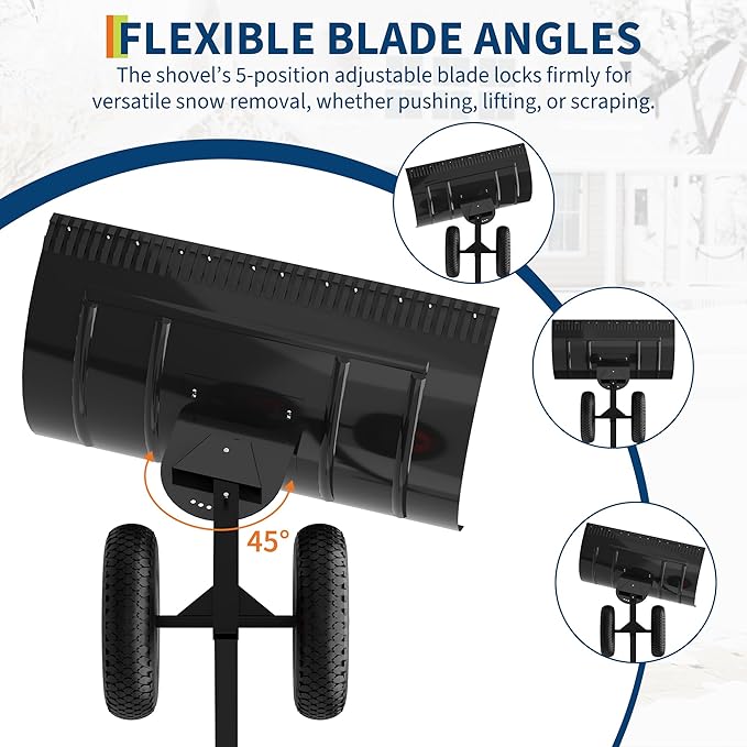 - 3,Multi-Angle Blade System: The blade locks securely into five positions, adapting to various snow depths and ground types. Change angles easily to improve clearing efficiency and save time and energy. This feature allows smooth operation on diverse surfaces like pavements, decks, and gravel pathways.