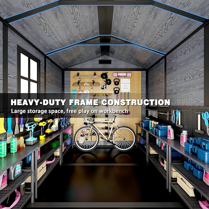 - ALL-WEATHER DURABILITY: Crafted from premium-grade thermoplastic synthetic resin, this backyard storage shed can withstand various elements; Its 12mm thick double-layer resin panels won't easily deform or crack; The shed's waterproofing, and UV resistance make it suitable for diverse weather conditions; The fade-resistant, friendly materials help achieve low maintenance costs and durable longevity