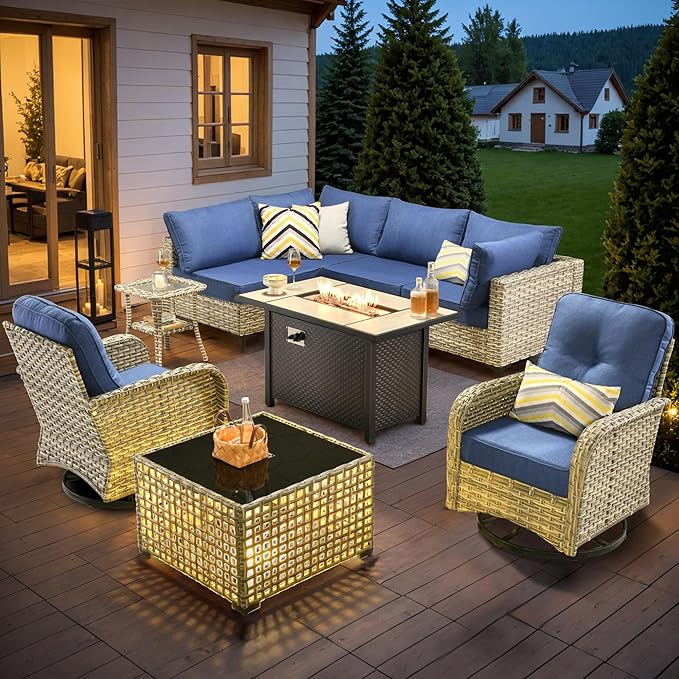 HOOOWOOO Outdoor Patio Furniture Set with Fire Pit Table,9 Pieces Wicker Out Door Sectional Furniture L Shaped Couch,Outside Patio Conversation Sets Swivel Chair,Denim Blue
