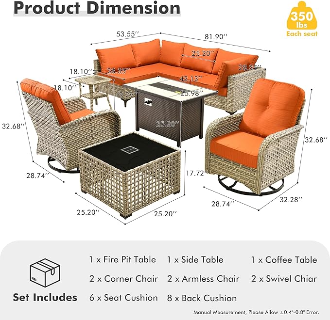 HOOOWOOO Outdoor Patio Furniture Set with Fire Pit Table,9 Pieces Wicker Out Door Sectional Furniture L Shaped Couch,Outside Patio Conversation Sets Swivel Chair,Brick Red