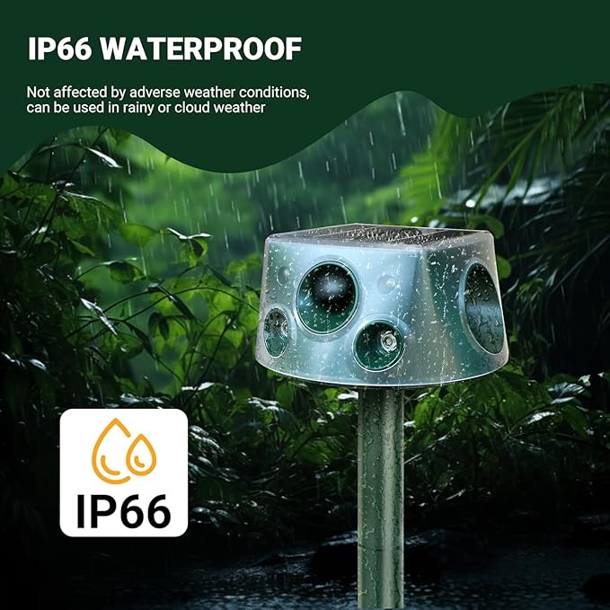 - 【Waterproof Feature】This racoon repellent outdoor ultrasonic rated IP66 for waterproofing, it can withstand various extreme weather conditions, ensuring reliable performance and a longer service life all year round.