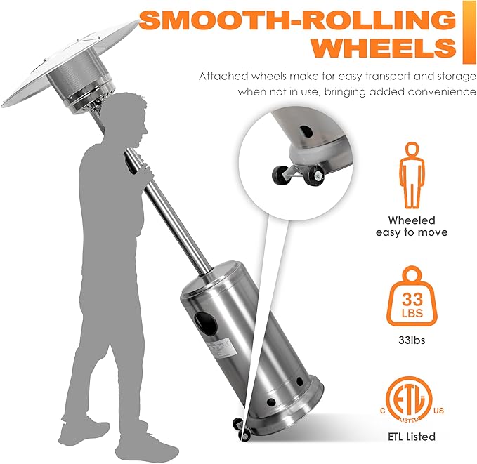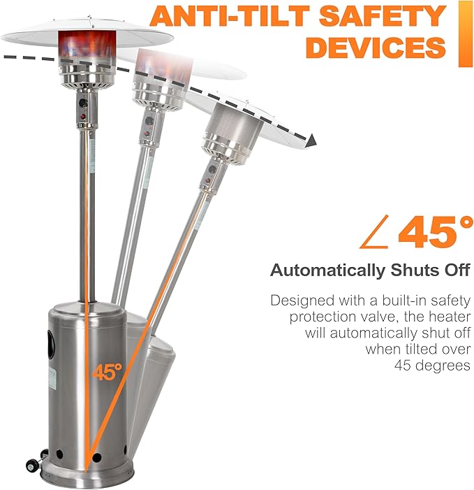 - INTERLLIGENT FLAMEOUT SYSTEM: Designed with a built-in safety protection valve, this outdoor propane patio heater will automatically shut off the fuel supply in time when outdoor propane gas heater tips over at a 15-degree angle