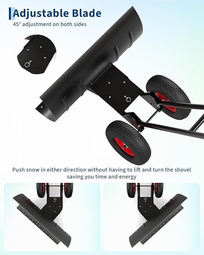 - Efficient Snow Clearing: This wheeled snow shovel is designed for fast and thorough snow removal. Its extra-wide 29" blade effortlessly clears two-inch snow layers in one smooth pass. For best results, use right after snowfall to prevent accumulation. The lightweight yet sturdy construction allows for easy maneuvering, but avoid hitting curbs or hard surfaces to protect the blade.