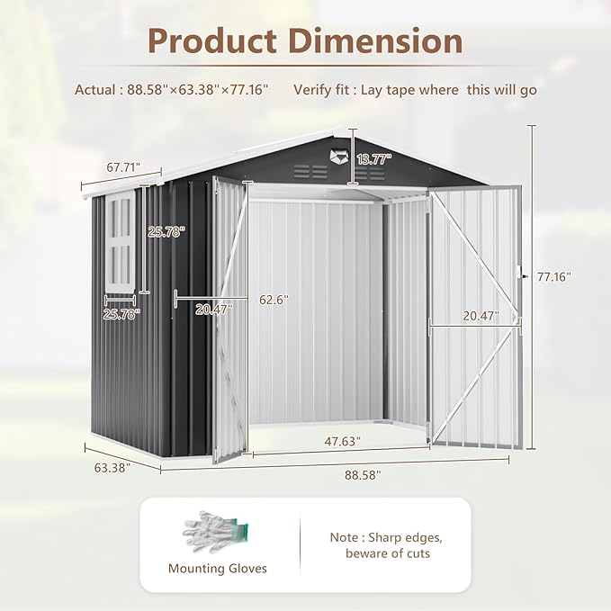 - 【Storage Shed Size Selection】:This spacious outdoor shed measures 8 x 6 feet (88"L x 63"W x 77"H), providing around 247 cubic feet of practical storage space. Easily store lawn mowers, bikes, gardening tools, or outdoor equipment. Consider your backyard area and storage needs to select the optimal shed size.