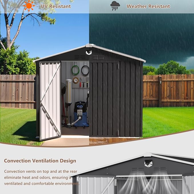 - 【Functional Ventilation & Design】:Designed for user convenience, this outdoor storage shed has an effective four-vent airflow system, a sloped roof that prevents water accumulation, and a new DIY translucent window that brightens the interior by allowing natural sunlight in. Lockable doors offer secure, easy access, making this a practical and efficient backyard storage solution.